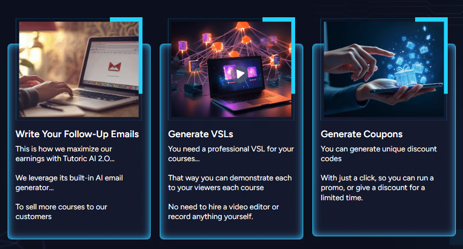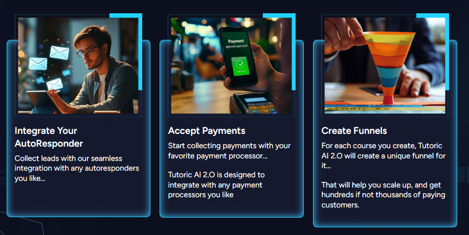 It takes marketing and sales to high level with its automated sales funnels. Tutoric AI 2.0 builds a unique funnel complete with landing pages, video sales letters, and email sequences designed for every course you create. That helps to convert visitors into paying customers.